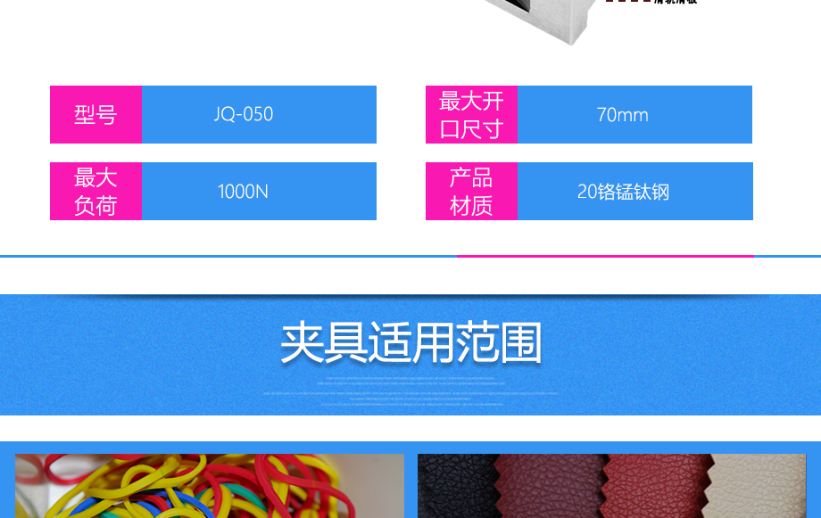 產品型號:JQ-050 品牌:劍 喬 用途:平口鉗夾具適用范圍:橡膠、各種線纜、紙、各種電器元件、塑料薄膜等材料的拉力,破壞力測試。