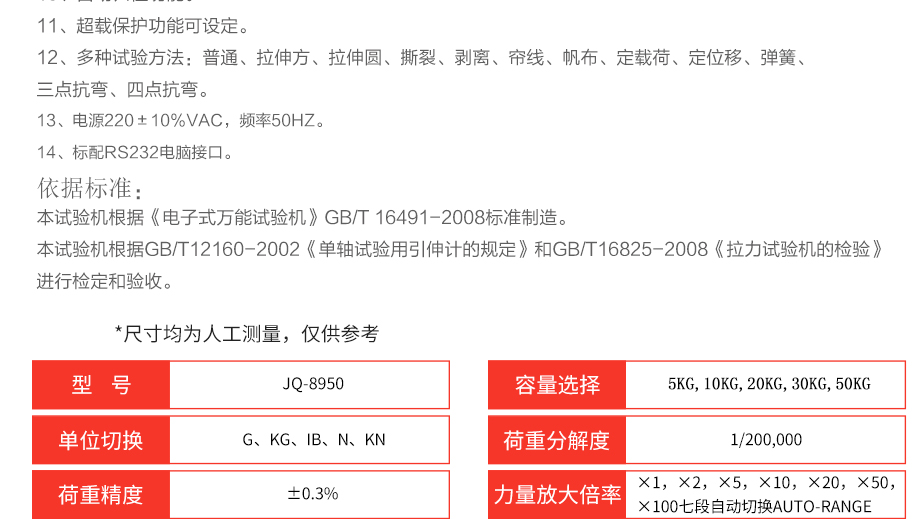 產(chǎn)品型號:JQ-8950 品牌:劍 喬 用途:本系列機(jī)廣泛用于各類薄膜、五金、橡膠料、紡織、建材、絕緣體、電線、電纜、端子等各類材料。測試其拉伸、撕裂、穿刺、剝離、抗壓、彎曲、抗剪切、定荷重、定位移、三點(diǎn)抗折