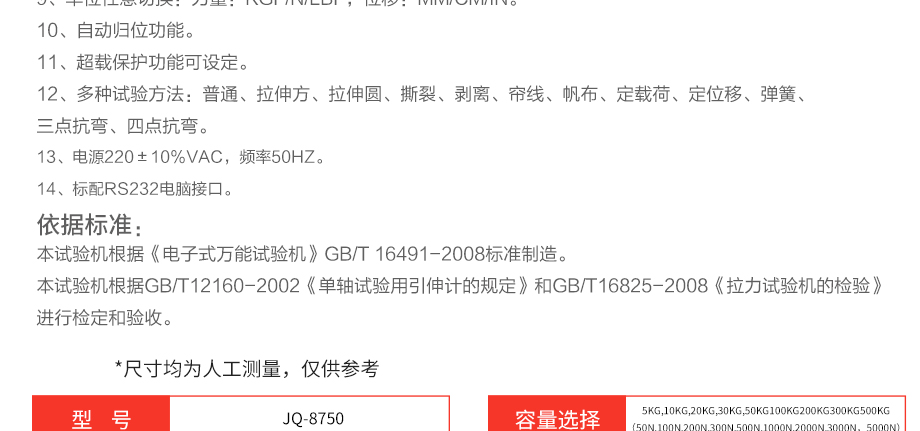 產品型號:JQ-8750 品牌:劍 喬 用途:本系列機廣泛用于各類五金、金屬、塑膠、橡膠料、紙品、包裝、鞋類、皮革、服裝、紡織、建材、絕緣體、電線、電纜、端子等各類材料。測試其拉伸、撕裂、剝離、抗壓、彎曲、抗剪切、定