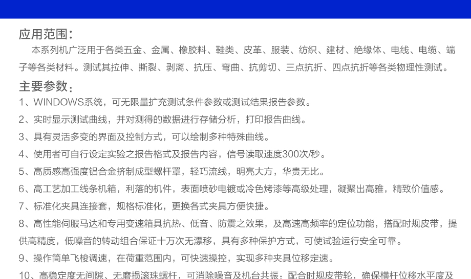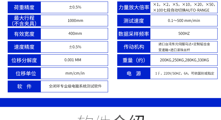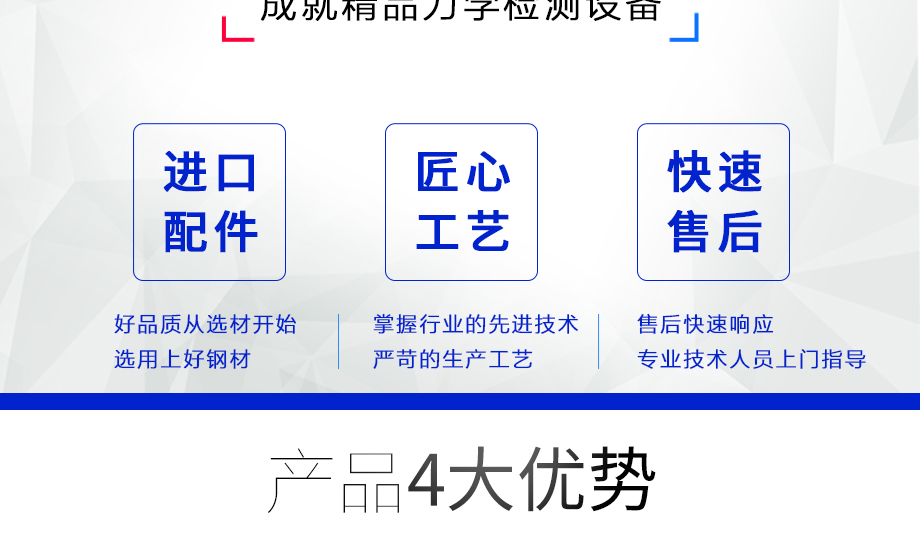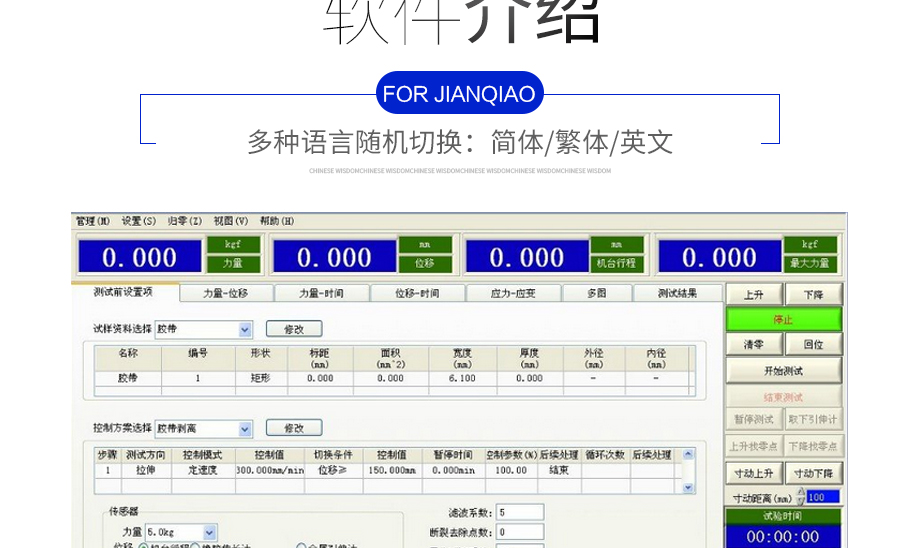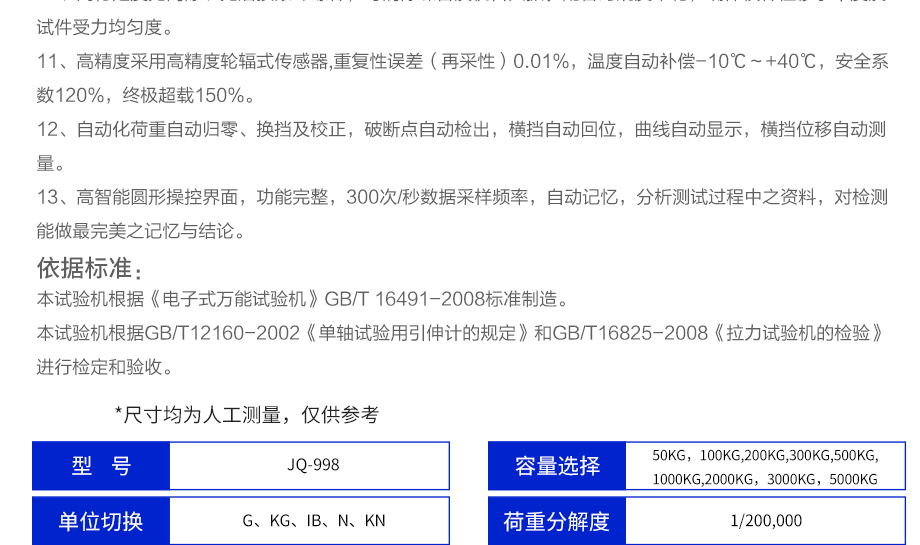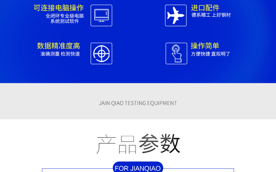 產品型號:JQ-998(高端定制款) 品牌:劍 喬 用途:高端雙柱拉力機主要測試原物料、成品、半成品的物理特性,可做抗拉力測試、抗壓力測試、抗彎測試,取得伸長量、伸長率、應力、應變等測試結果及測試資料。